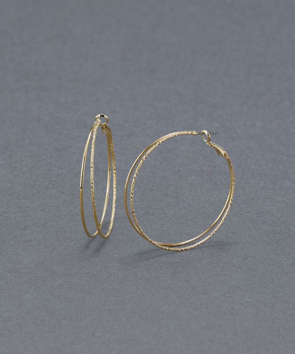 テクスチャーを施した煌めくラインのフープピアス。動くたびに繊細な煌めきを放つデザインは耳周りを女性らしく演出し、コーディネートに華やかさとこなれ感を.. |