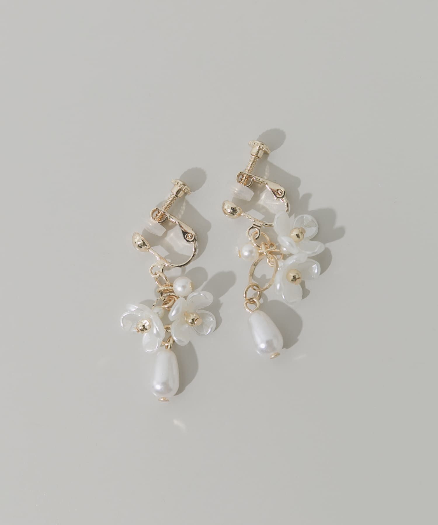 【可憐な花が揺れるホワイトフラワーイヤリング】●白い小花を束ねた立体的なブーケデザイン●動くたびに優雅に揺れるドロップパール●顔周りを明るく清楚に彩る..