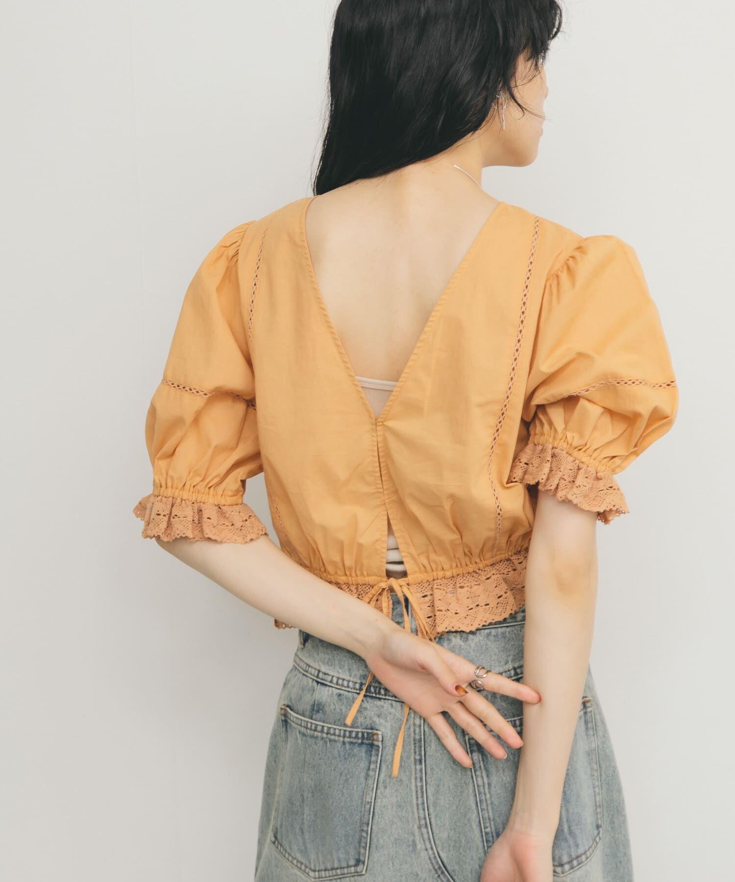 【バックデザインが抜け感を演出するシアーブラウス】前から見ると一見シンプルですが、バックデザインが特徴的なブラウス。後ろが開いているので簡単に抜け感.. |