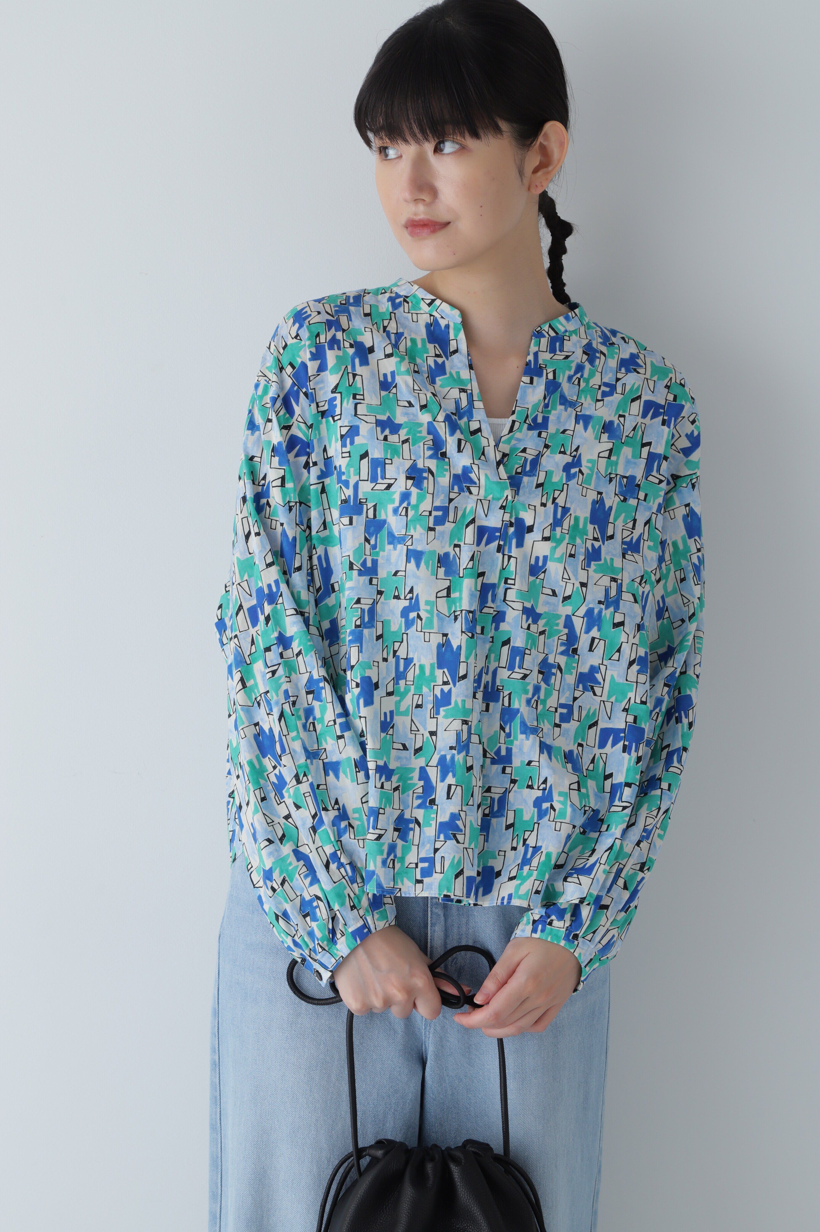 テキスタイルデザイナー矢嶋絵里子さん×human womanコラボのアートプリントブラウス【デザインのポイント】スキッパー風な首元に、ボリュームをもたせた袖がポ.. |