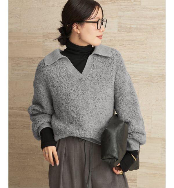 ウールナイロンのフェザーヤーンで仕立てた、テディベアのような柔らかなボア編地のスキッパーニット。衿やリブはボアなしの編地で切り替え、メリハリのあるデ.. |