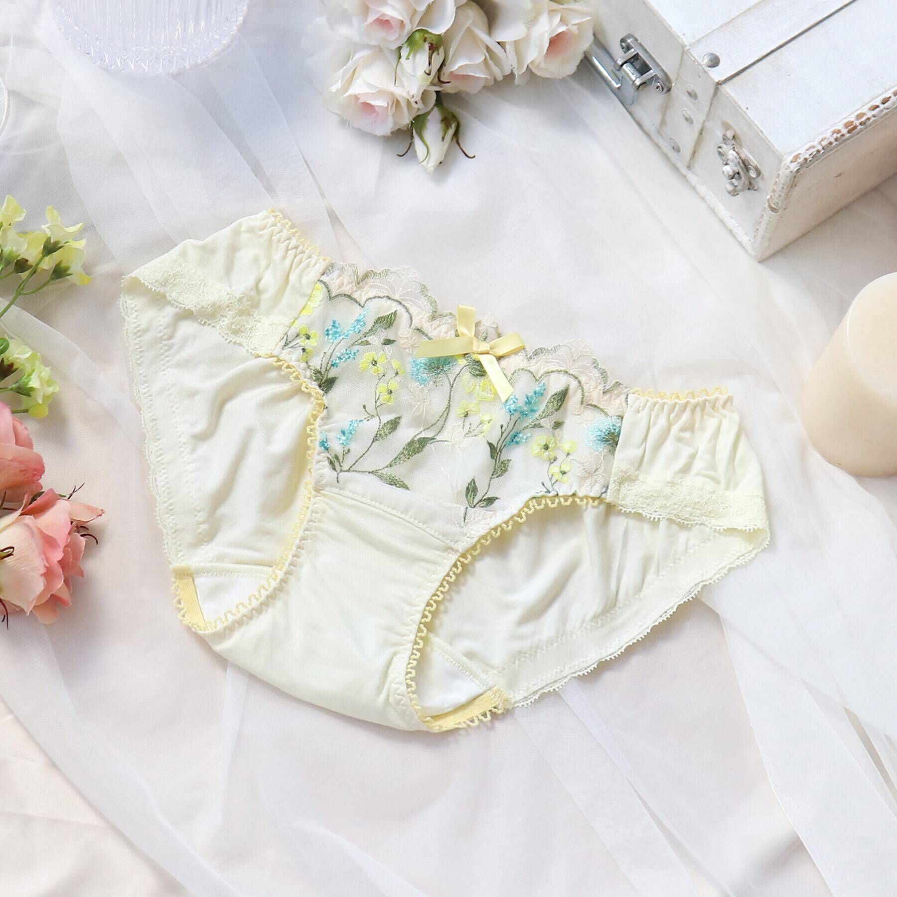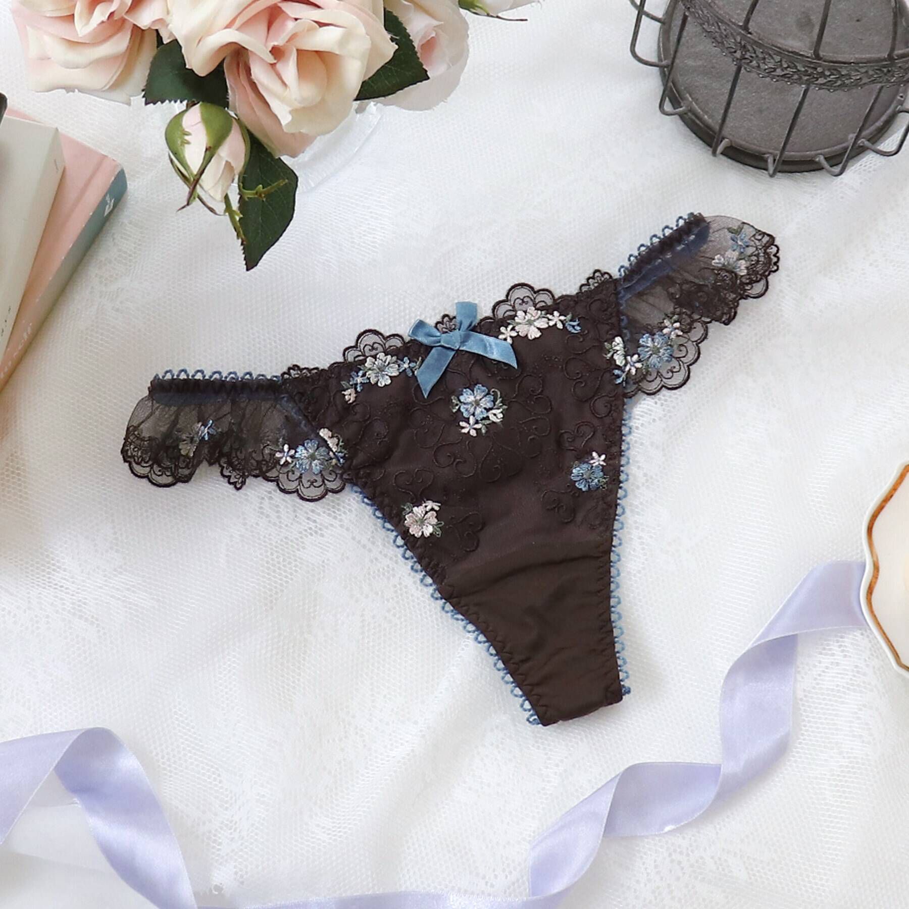 【お花を身につけて、何気ない日常をHappyに】たくさんの小花をフロント部分に散りばめた「メルティ」シリーズ。パッカー手法を用いた特殊なレースを使用し、..