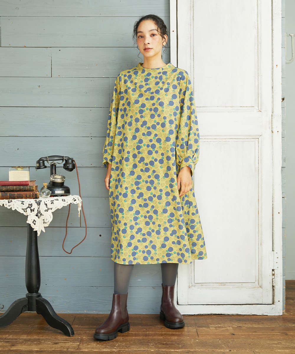 Calle de la Bola(ボラ)=球 ■デザイン カラフルなドットが目を惹くホコモモラらしいプリントワンピース。シンプルなフレアシルエットでゆったりと快適な着.. |