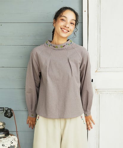 Flor pequena(フロル ペケニャ)= 小さい花 ■デザイン チェックと刺繍の組み合わせが魅力的なブラウス。ラグランスリーブと前後に入っているタックでゆとりを.. |