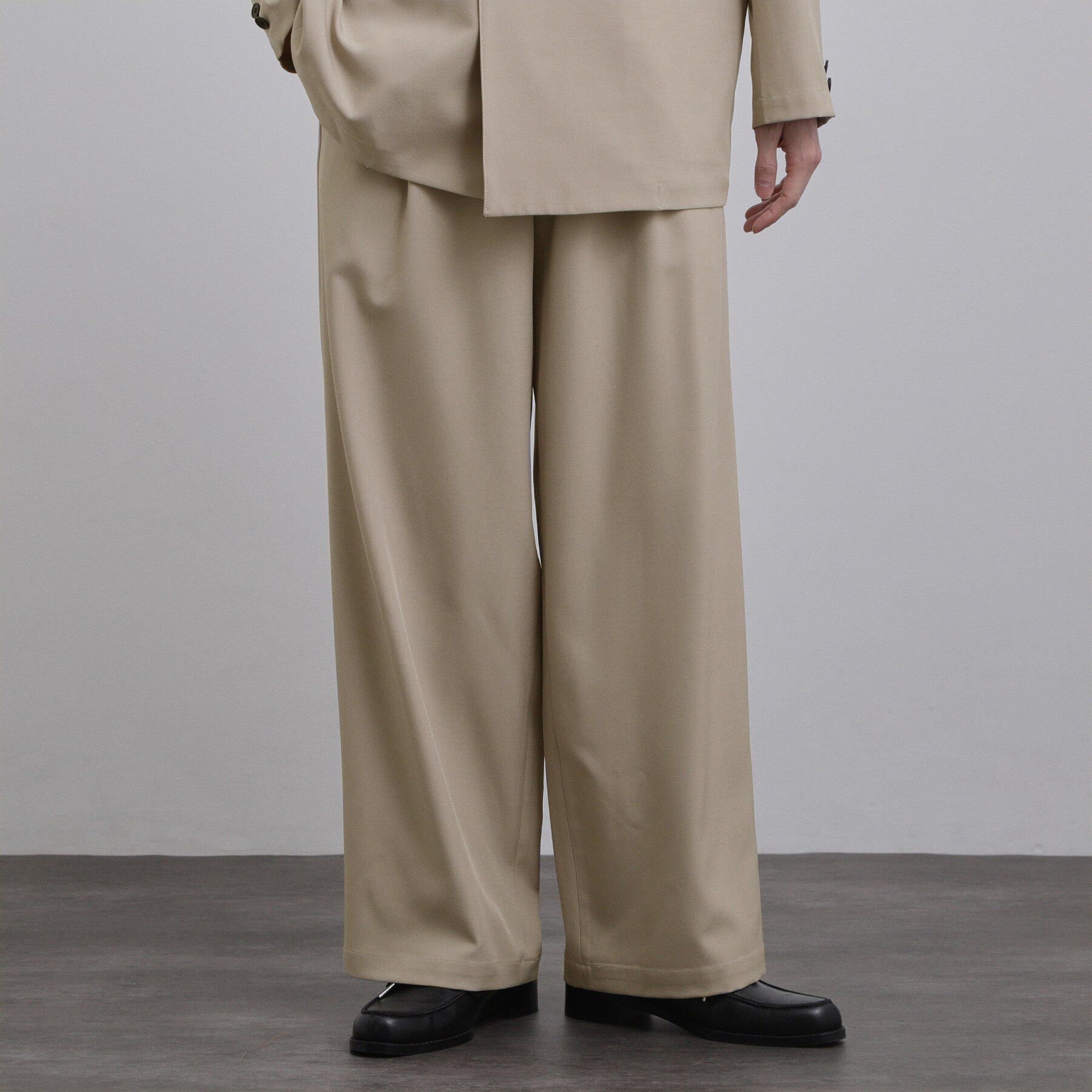 【素材】ポリエステルとレーヨンをかけ合わせたウール調の合成繊維を使用しています。ポリウレタンを少量混合することで生地に反発性が生まれ、程よいハリ感に.. |