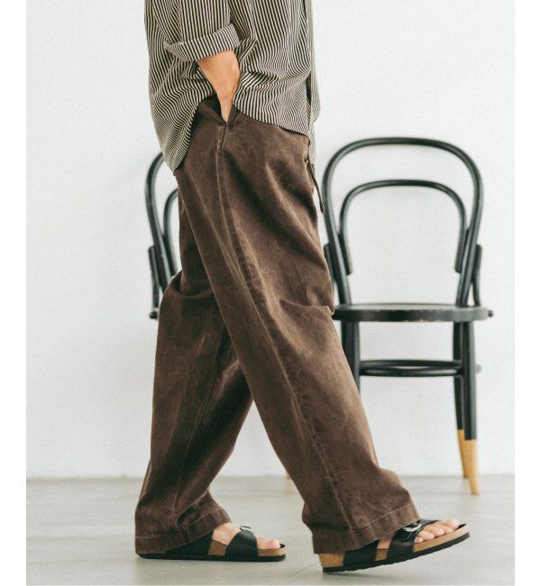 ・デニムライクな風合いのコットンツイル素材を使用し、製品洗いによる自然な当たり感が特徴・古着のような表情と柔らかな質感で、今のトレンドを感じさせる1.. |