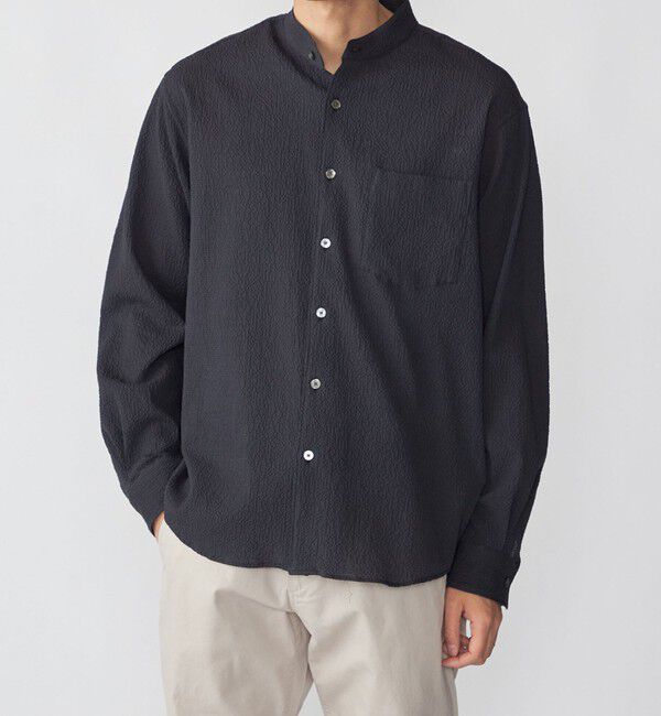 肌離れの良いサッカー生地を使用した大人顔のバンドカラーシャツ【素材特性】細さの異なる2種類のコットンを交織した2WAYストレッチのサッカー素材を使用。従.. |