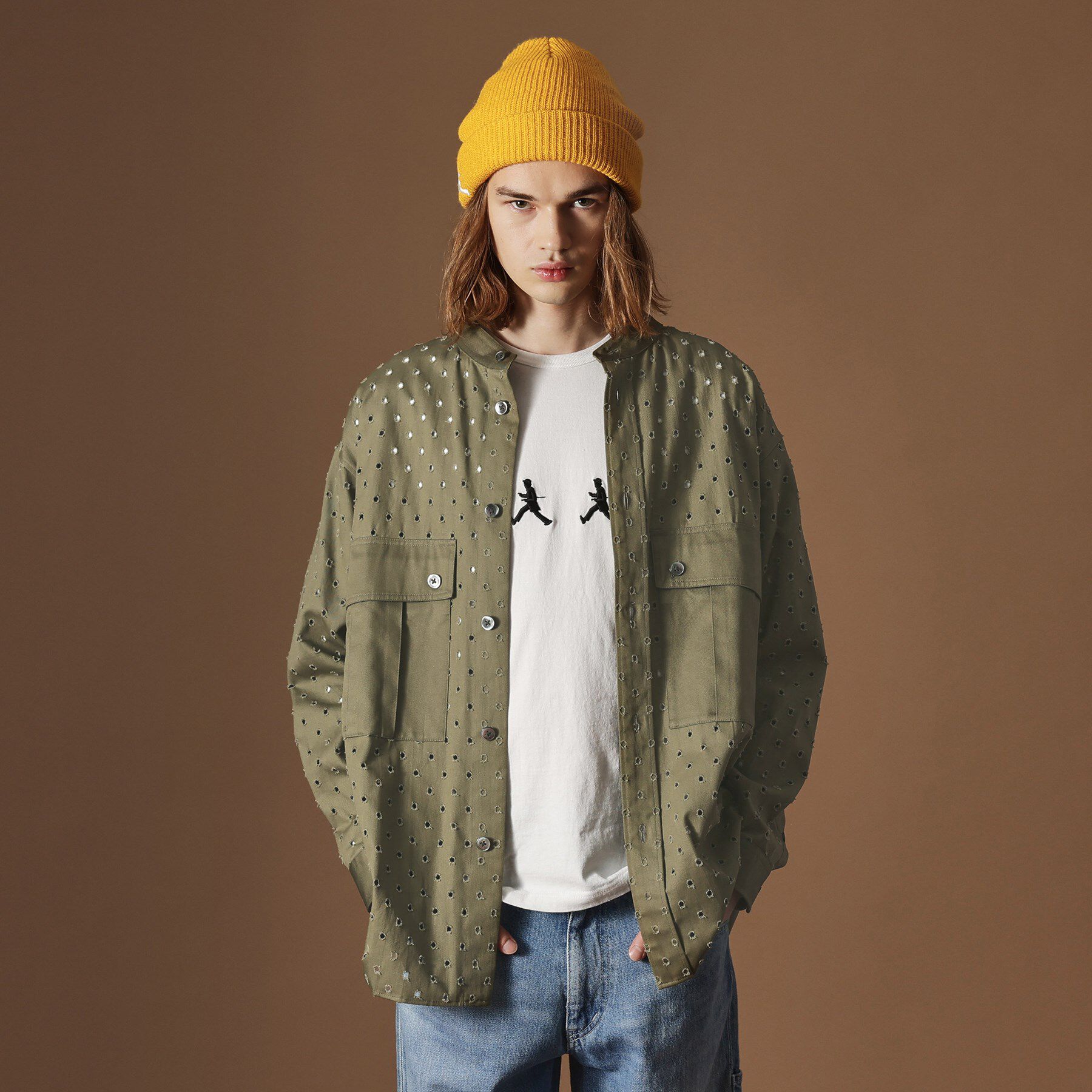 【デザインポイント】ミリタリー風なデザインと一風変わった素材で仕立てたオーバーサイズシャツ。オパール加工という特殊な加工によりドット状に穴を開けた素.. |