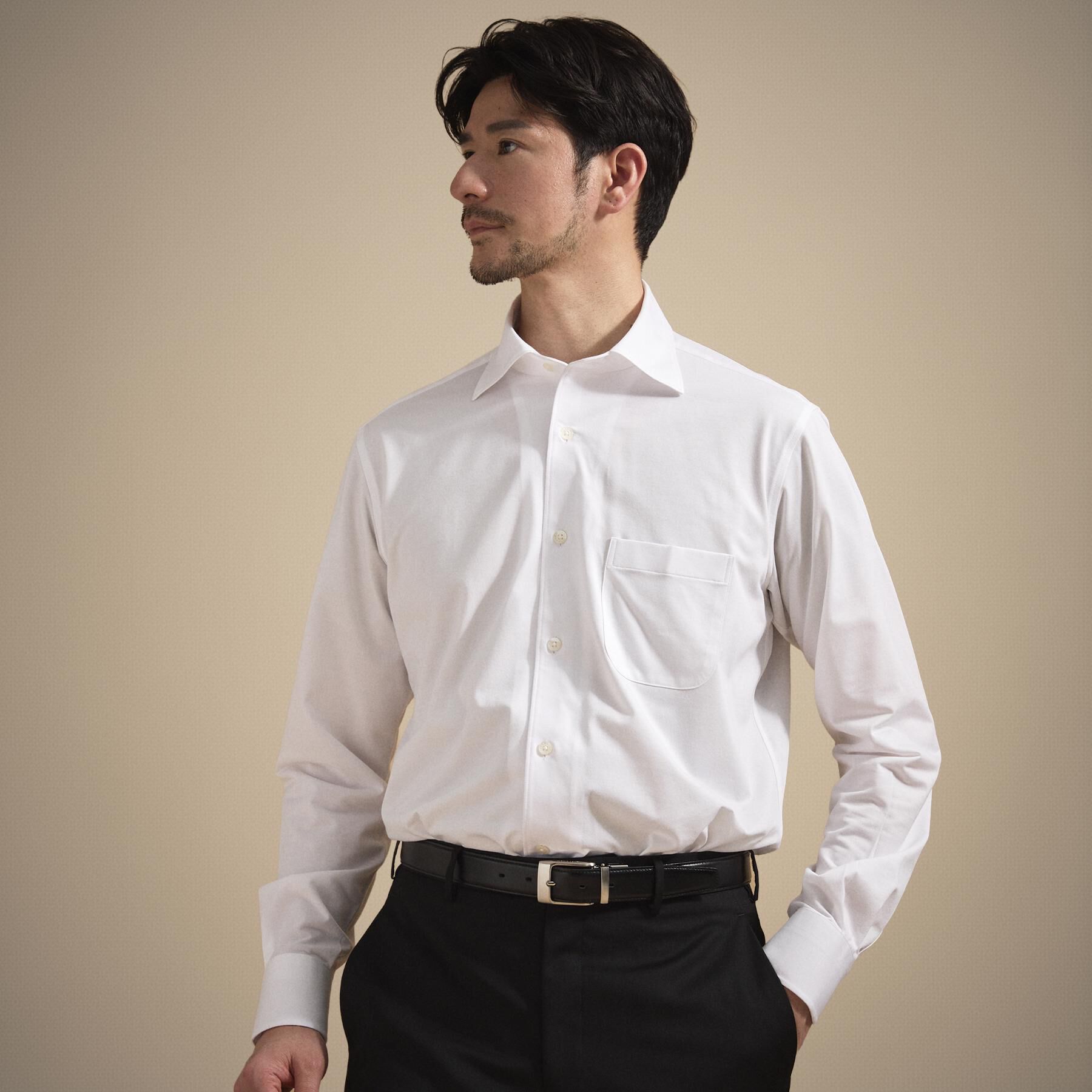 ジャージ素材のシャツは現代ビジネスシーンにおけるシャツの定番素材。クールマックス(R)機能付き、ホリゾンタルカラードレスシャツです。【デザインポイント.. |