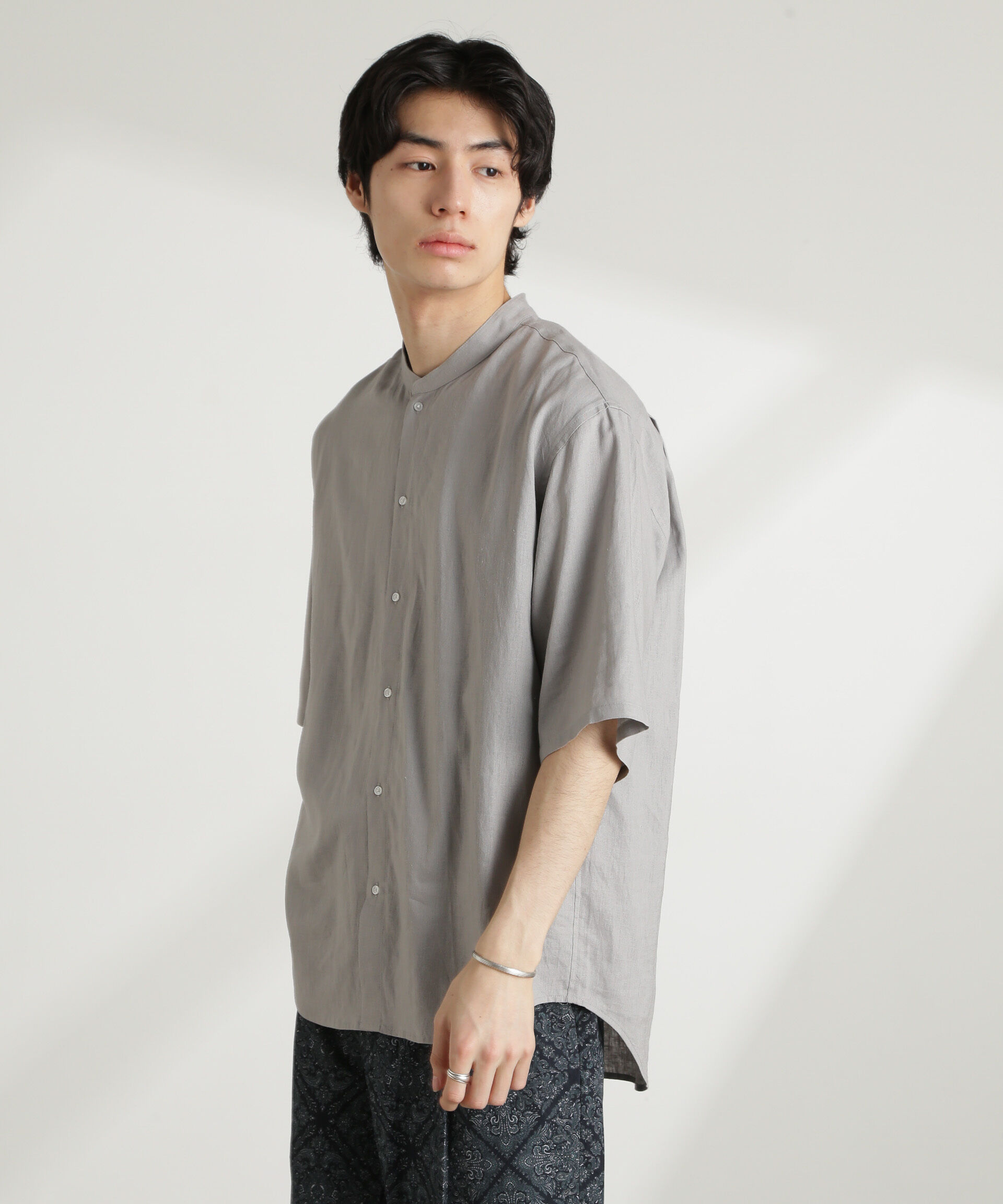 【ナノ・ユニバース/NANO universe】 アンチスメルリネン バンドカラーシャツ 半袖