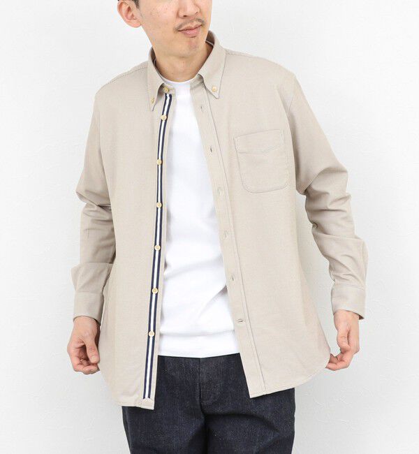■デザインドット柄をフリンジ調に仕上げた生地を使用した〈BEAMS PLUS〉ボタンダウンシャツ。クラシックな印象を残すフロントの6ボタンは、ボタン位置を少しず.. |