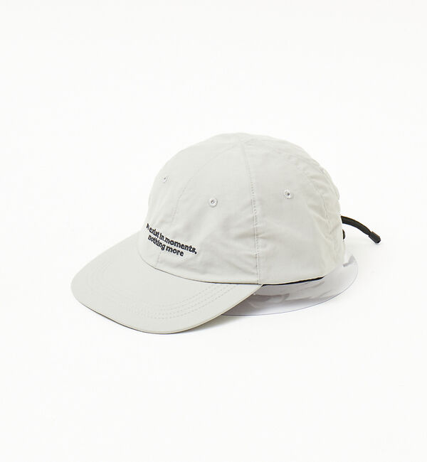 【デザイン】ナイロンと綿の頑丈な生地にメッセージ刺繍をあしらえたジェットキャップ。バックアジャスター部にはドローコードを採用し、垂れ下がっているコー.. |