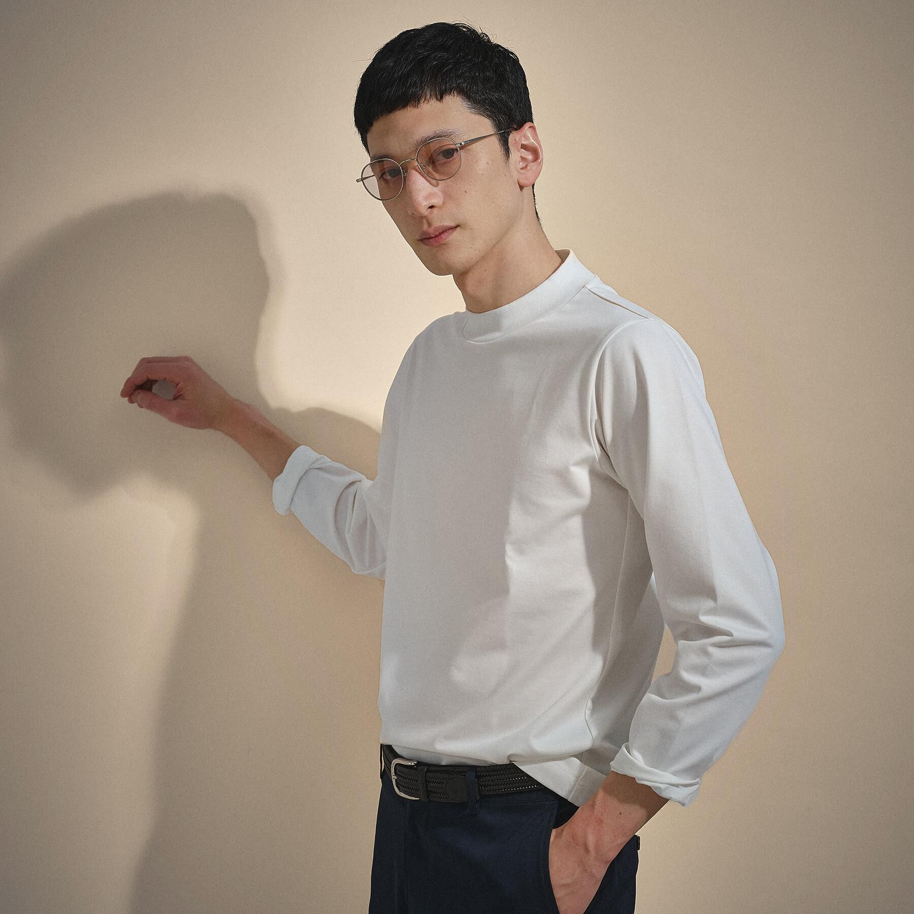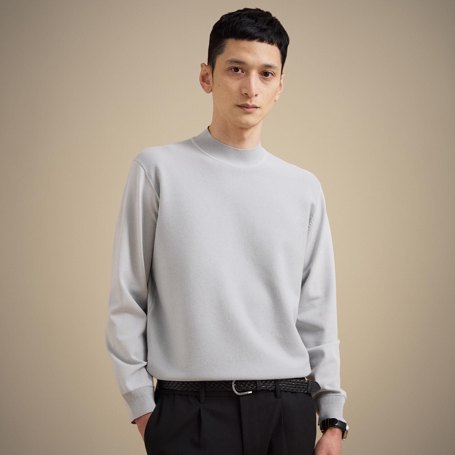 ビジネスからカジュアルまで、ON/OFF問わず活躍するモックネックインナー。ジャケットとの相性を考慮した程よい立ち上がりのネックラインが首元を美しく演出.. |