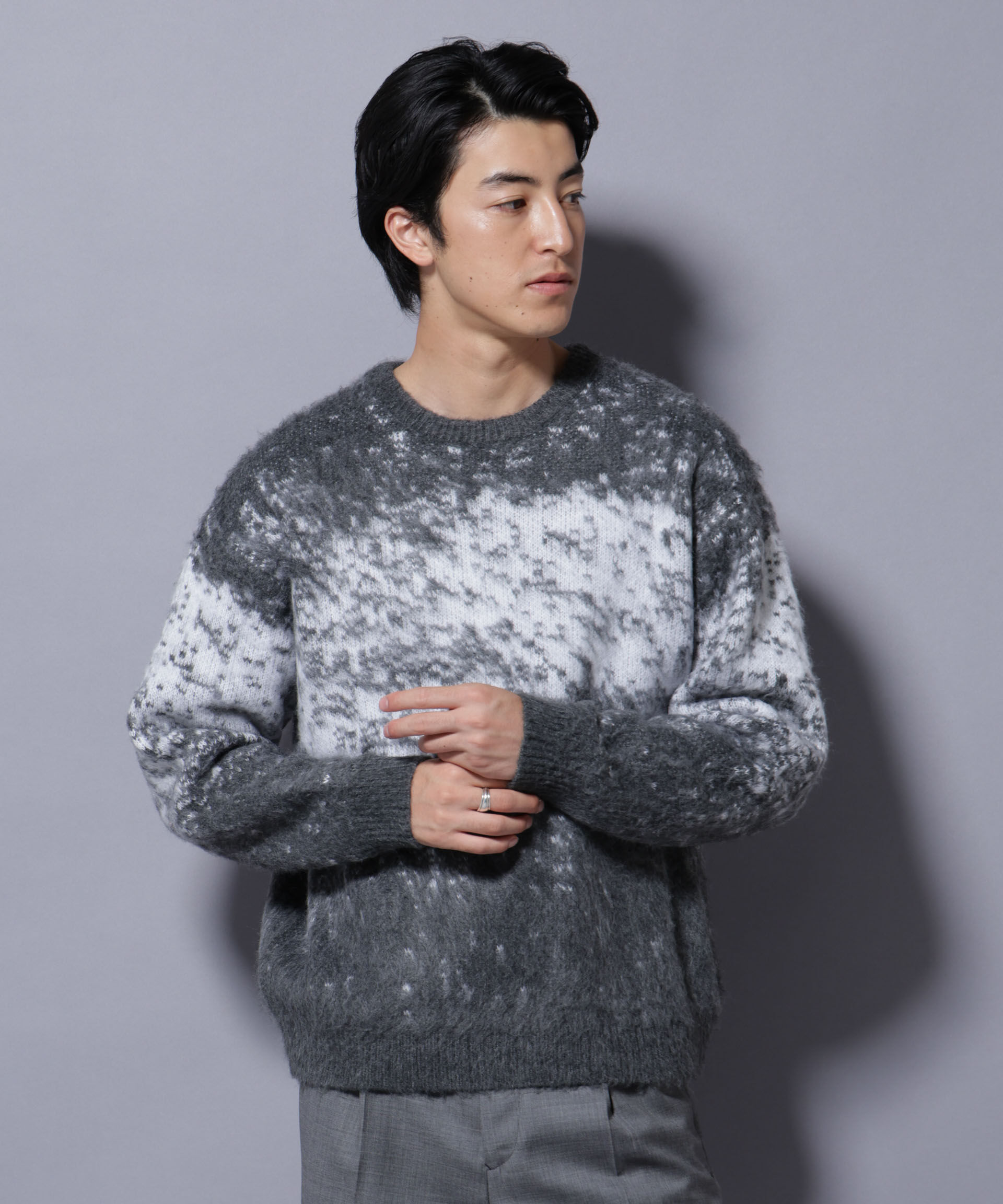 目を引くオリジナル柄とふんわり軽いモヘヤ風素材が魅力【2024 AW】NANO universe(ナノ・ユニバース)主役級のひと癖あるオリジナルのパターンが魅力のクルー.. |