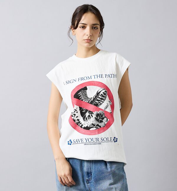 「Save Your Sole」グラフィックを配したDEUSのノースリーブTシャツ。肩を覆うカットオフスリーブと程よいゆとりのシルエットで、Tシャツ感覚のラフな着こなし.. |