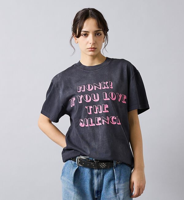 「HONK! IF YOU LOVE THE SILENCE」のピンクプリントをフロントに配したHonk Tee。背面にはトランペット風のグラフィックと「deus」ロゴで後ろ姿にも存在感を.. |
