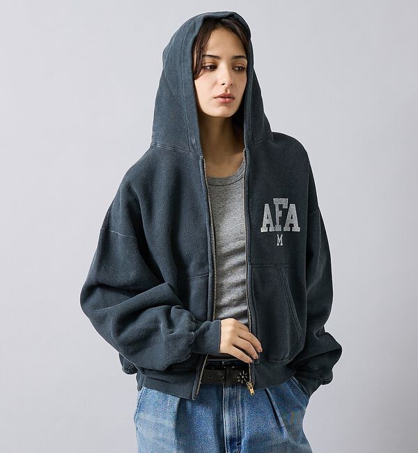 REMI RELIEF独自のSP加工で、90年代スウェット特有のフェード感と着古した風合いを再現したZIPパーカー。起毛裏毛のラフな質感と、当時を思わせるルーズな雰囲.. |