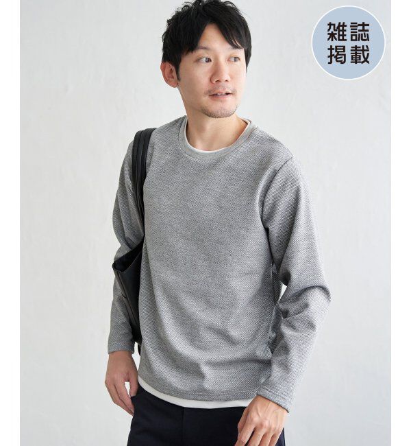 【雑誌 MonoMax(宝島社)4月号掲載】表面に立体感を生むパイナップル編みのカットソーを使用したフェイクレイヤードロンTです。一枚で着てもサマになるフェイク.. |