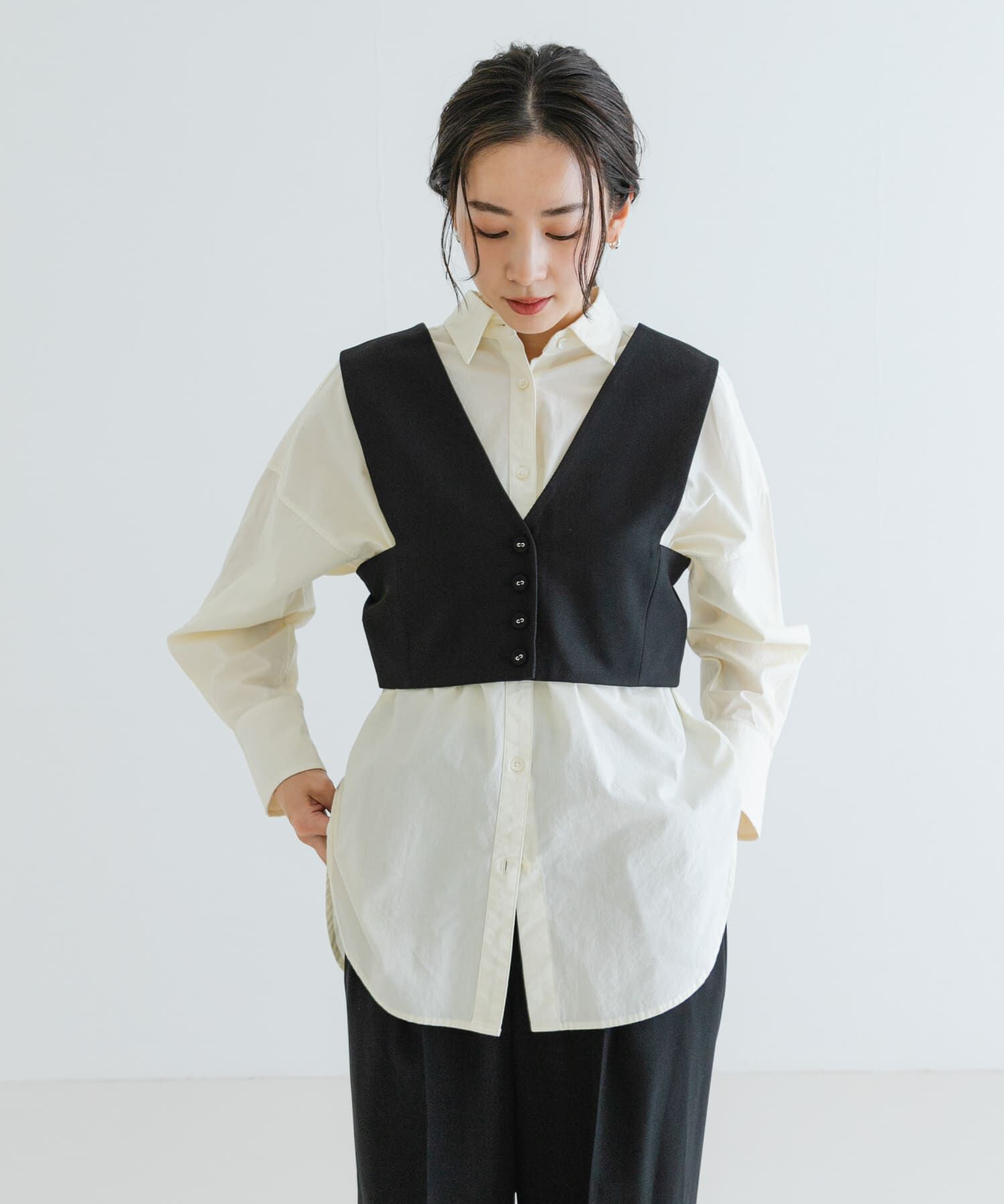 【アクセサリー感覚で楽しめるミニベスト】いつものスタイリングをアップデートしてくれるプラスワンアイテム。ストレッチ性のあるカルゼ素材を使用してるので.. |