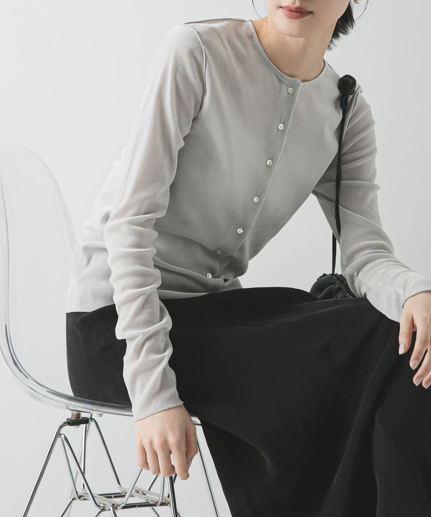 シアーフロッキーの素材感が際立つ、一枚で着映えるコンパクトカーディガン。繊細な透け感が魅力のフロッキーチュール素材を使用しており、シアーな表情に立体.. |