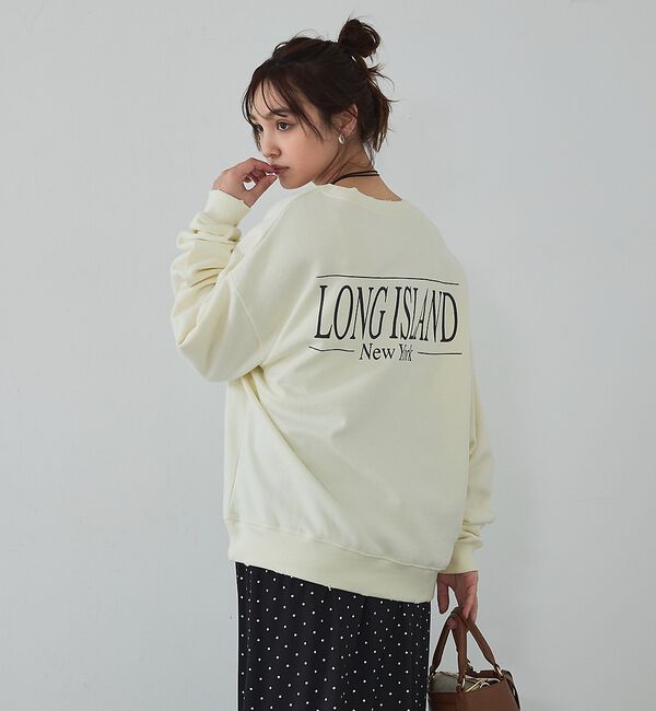 【Design】メンズライクなサイズ感の裏起毛スウェット。ヴィンテージ感を演出するダメージ加工と刺繍で施したロゴで本格見えするアイテム。首元はややゆったり.. |