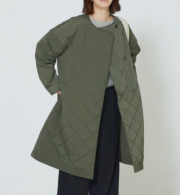 【Design】ダブル前のシンプルなノーカラーコート。裾のステッチが上品で大人な雰囲気に仕上がります。マットなキルティング素材ながらカジュアルになりすぎな.. |