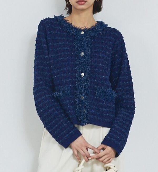 【Design】柔らかく着心地の良いジャケット風ニットカーディガン。端のフリンジが華やかなツイード織り、さらにシャネルカラーでジャケットとしての存在感をち.. |