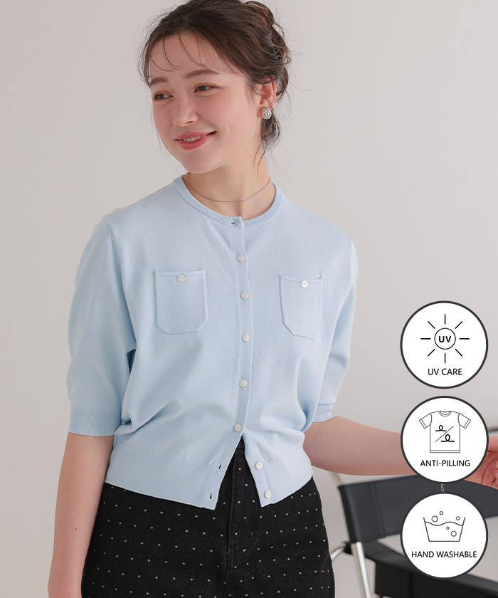 UVケア/抗ピル胸ポケットハーフスリーブニットカーディガン【メール便可/100】