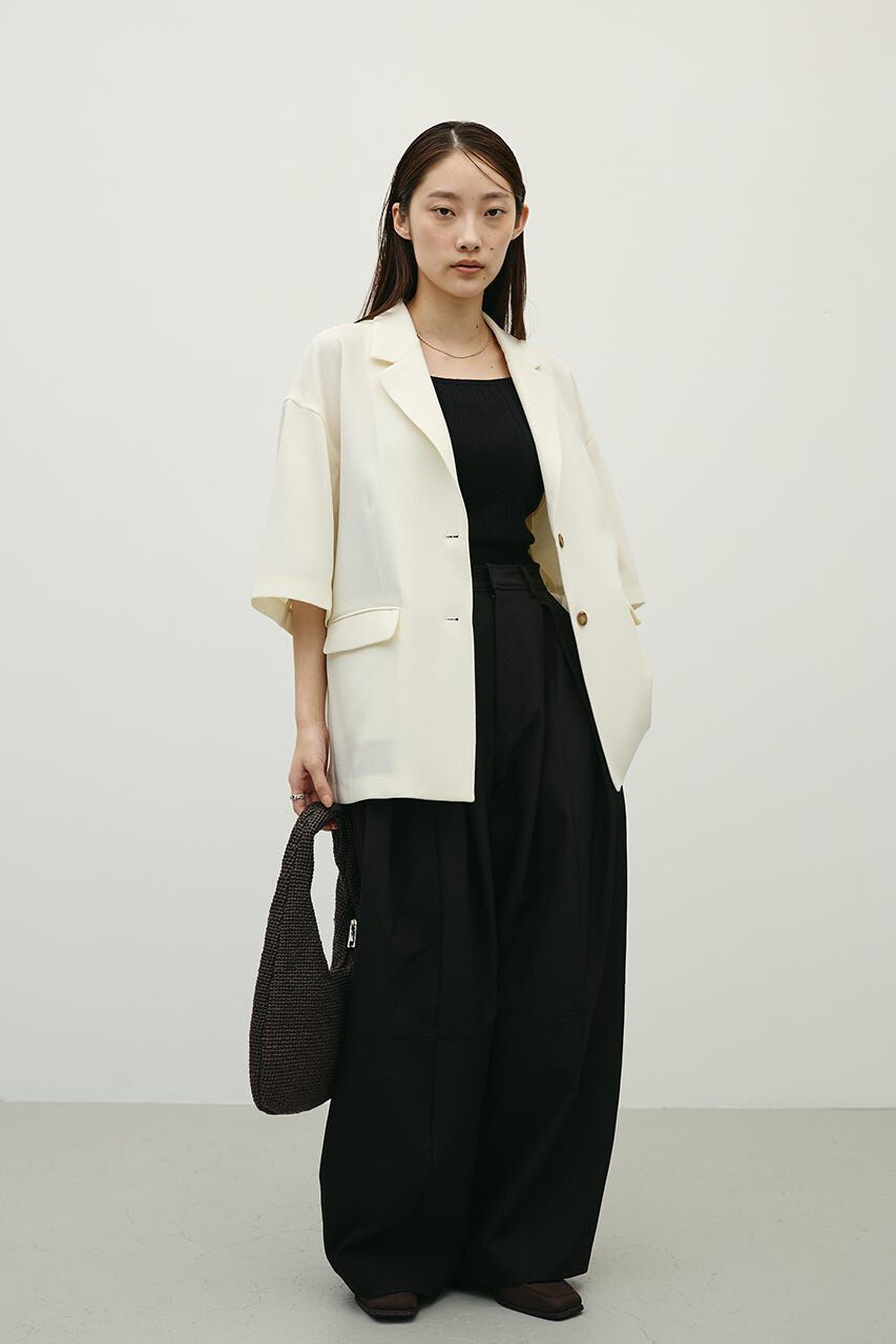 モデル身長162cm(FREEサイズ着用)スーツ生地のようなきれいめ素材を使用したショート丈のモードライクなフォルムジャケット。ディテールはシンプルにまとめ.. |