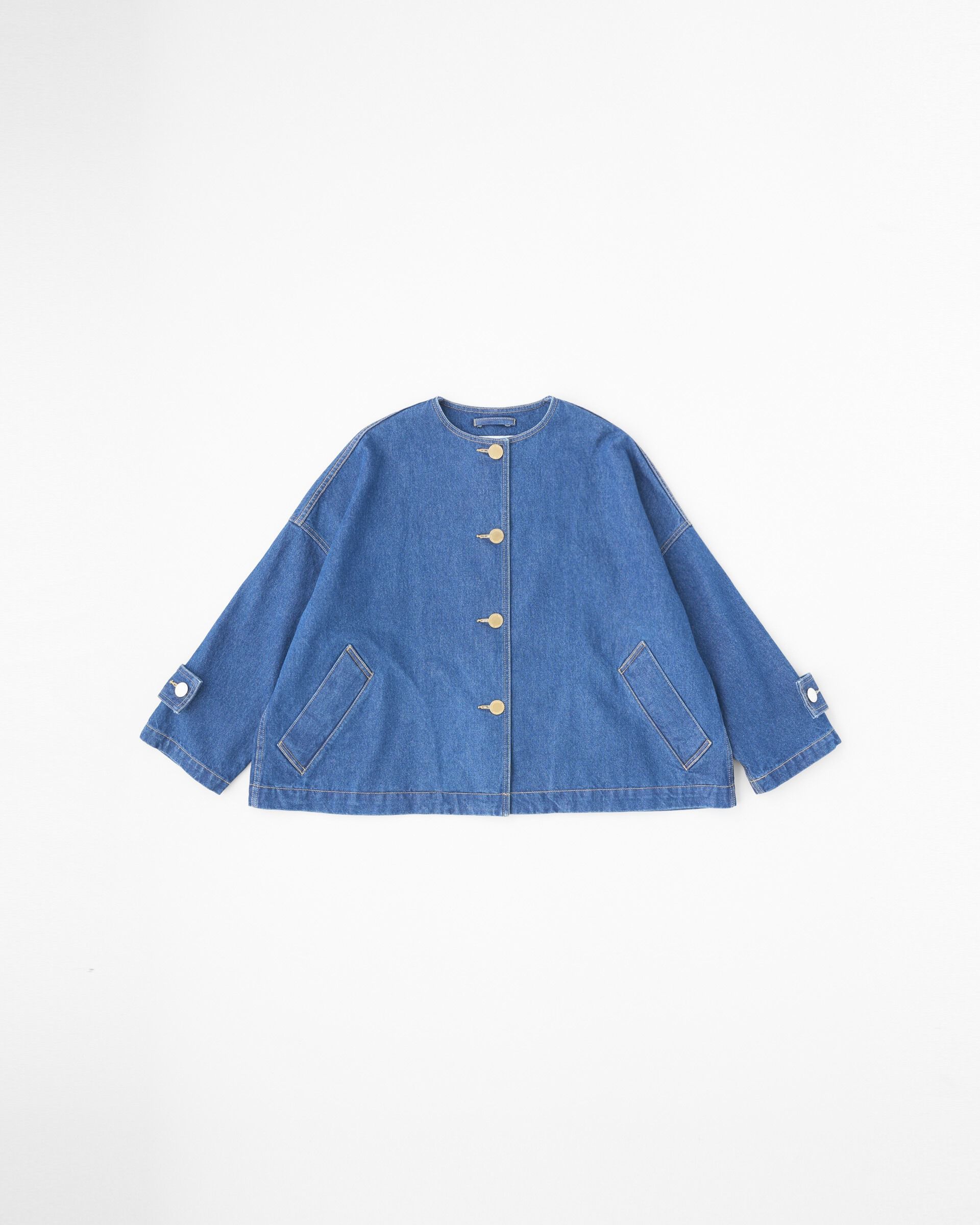 ドロップショルダーでオーバーサイズのコート、MALTON DENIM(マールトン デニム)のショート丈のノーカラーモデル。こちらのマールトン ノーカラー ショート .. |