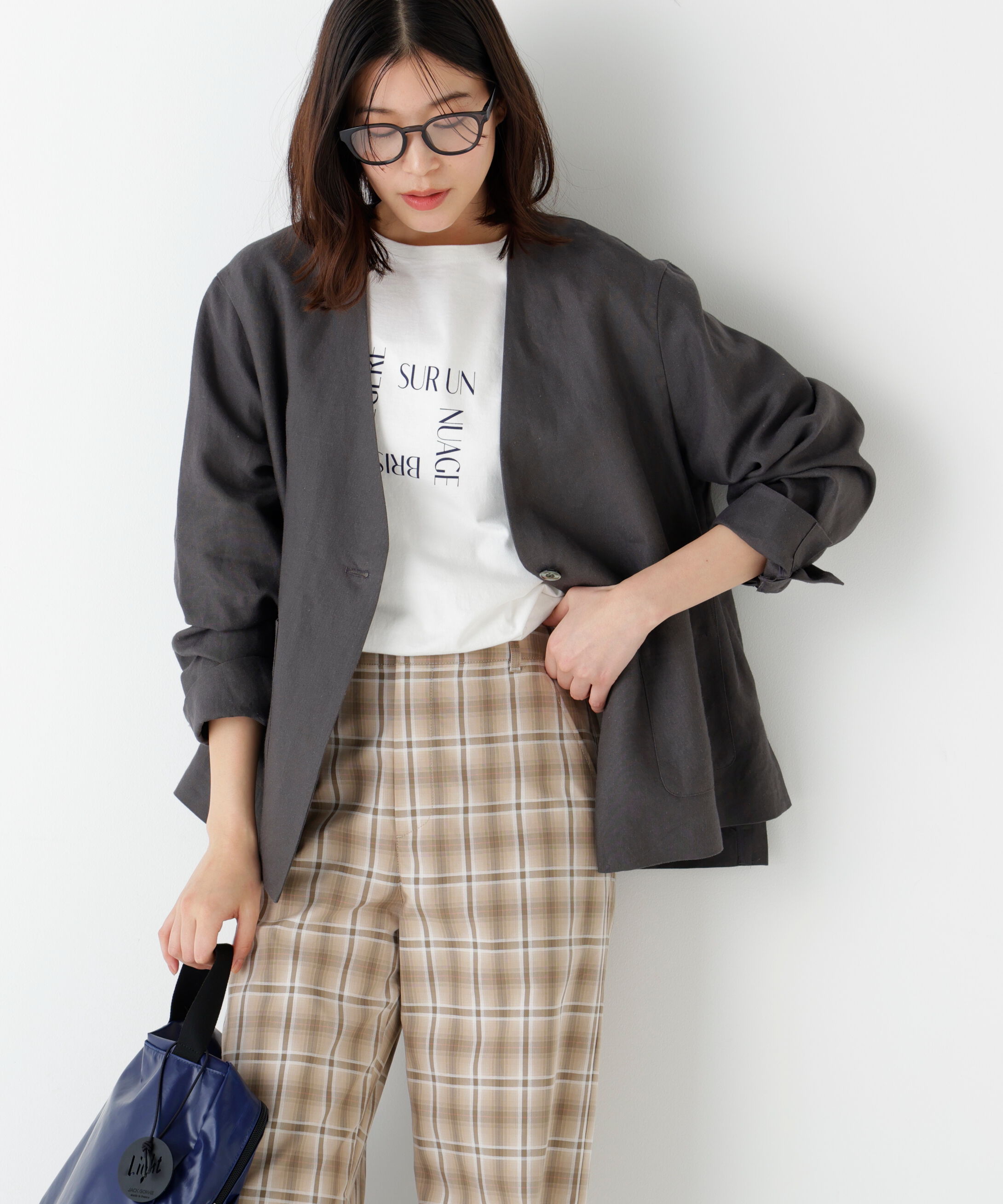 カーディガン感覚で羽織れるノーカラージャケット【デザインのポイント】抜け感あるボックスシルエットのノーカラージャケットです。ひとつボタンや裾脇のスリ.. |