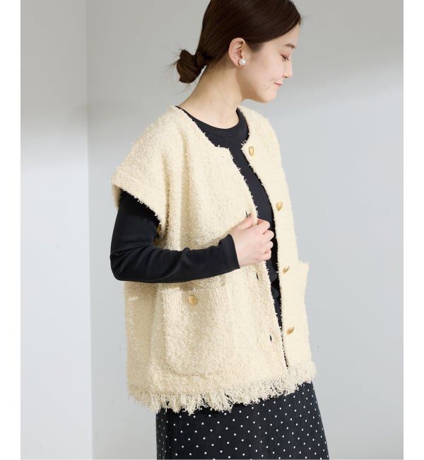 【2026SS】IENAインポートライクな高級感を放つツイード素材を使用したベスト。一見ザックリとした縦横の織り目ながら、実際はしっかりと密に織り上げられてお.. |
