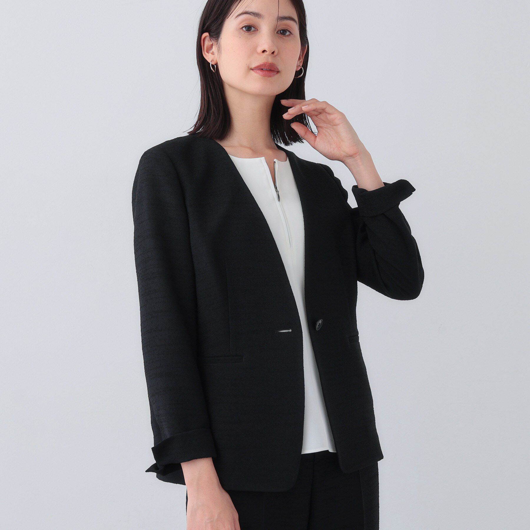 【デザインポイント】気軽に羽織れる衿なしタイプながら、釦使いや首にやや沿う衿ぐり、シャープなVラインできちんと感も併せ持つジャケットです。首に沿うよ.. |