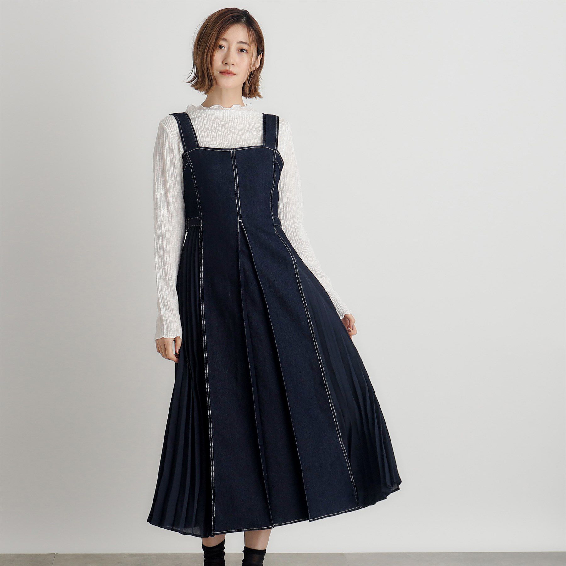 エレガンスもカジュアルも自在に操る2WAYワンピース【デザイン】ジレとしてもジャンパードレスとしても活躍する2WAY仕様のワンピース。スリットネックデザイン.. |