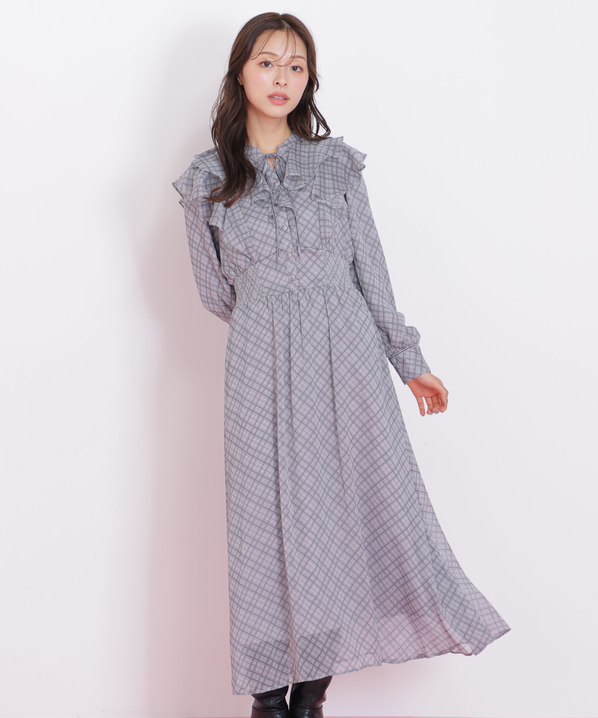 普段使いからお呼ばれシーンまで頼れるワンピース。繊細なシアーチェック柄にベロアのテープと釦を付けた上品なデザインです。ウエスト脇から後ろにあしらった.. |