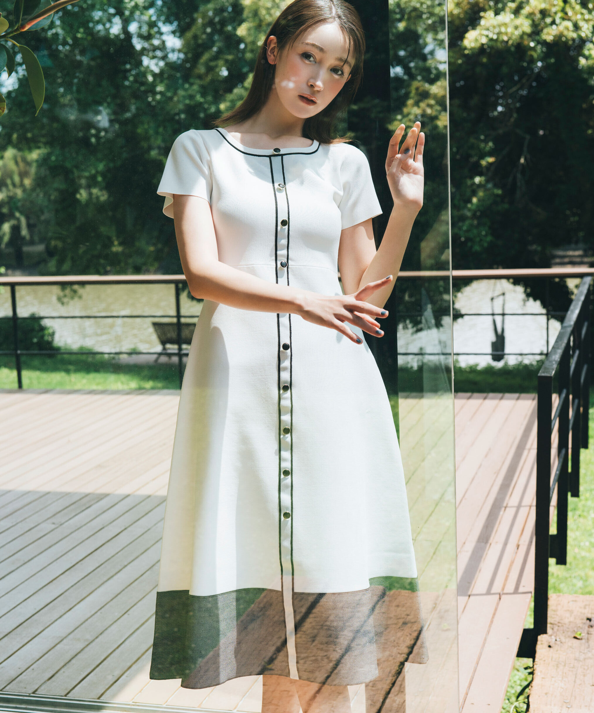 【デザイン】八分袖丈のふんわりスリーブがフェミニンなパネルプリントワンピース。顔周りとスカート部分に施した華やかなプリント柄がSunaUnaらしい印象です.. |