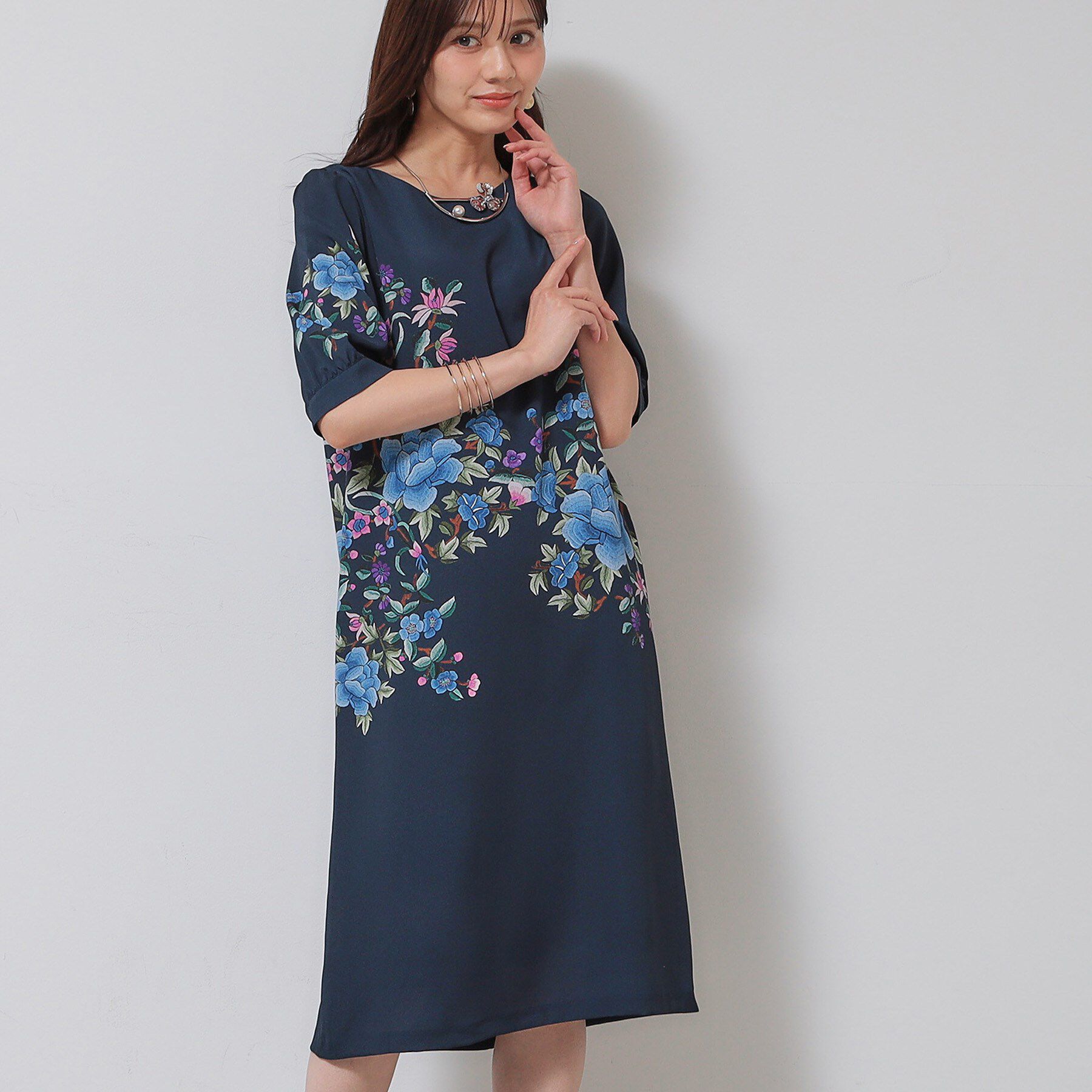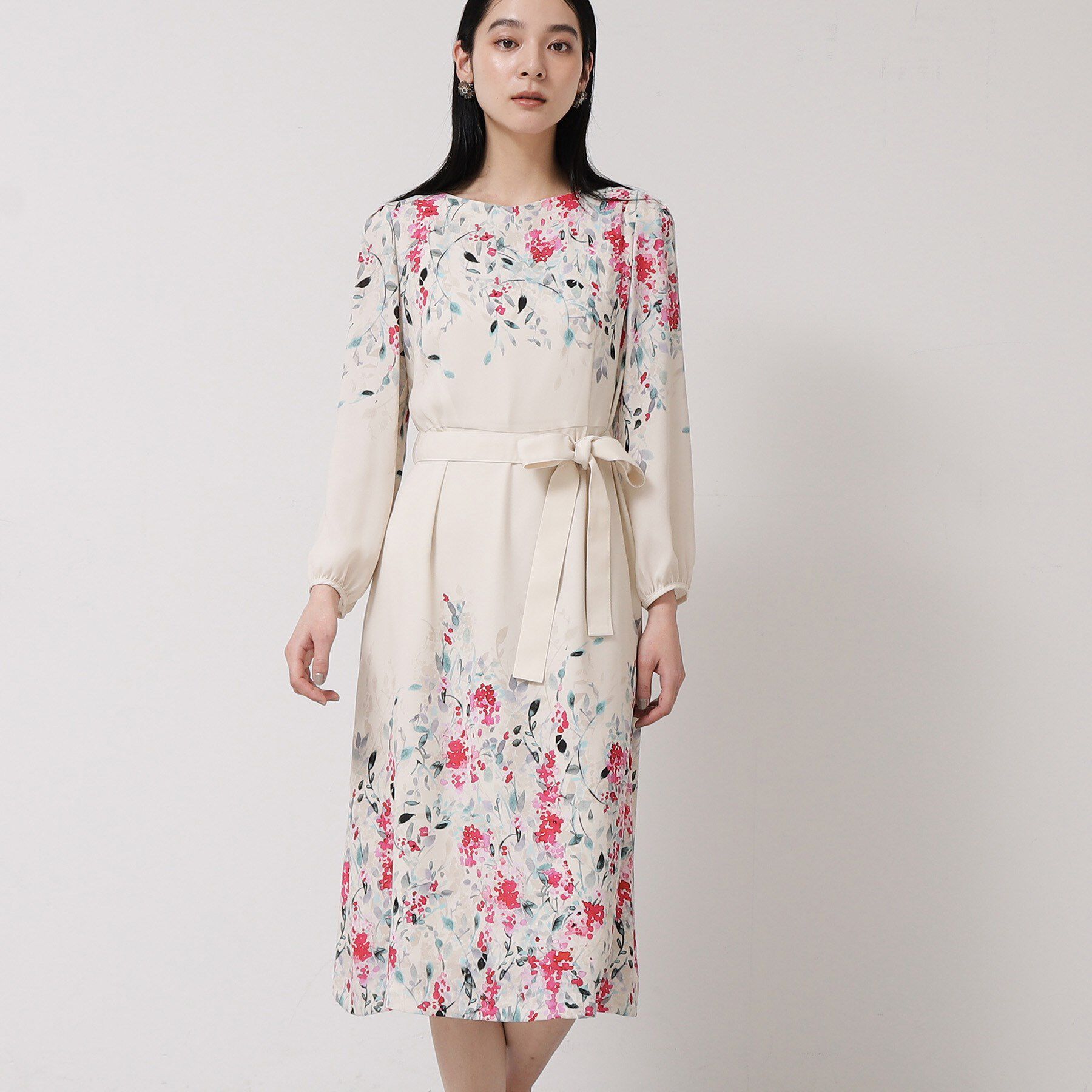 【デザイン】ウエスト周りに花柄をギュっと集中させたパネル柄のワンピース。ウエストには切替を入れず、パネル柄ならではの絵画のような美しさを際立たせた柄.. |
