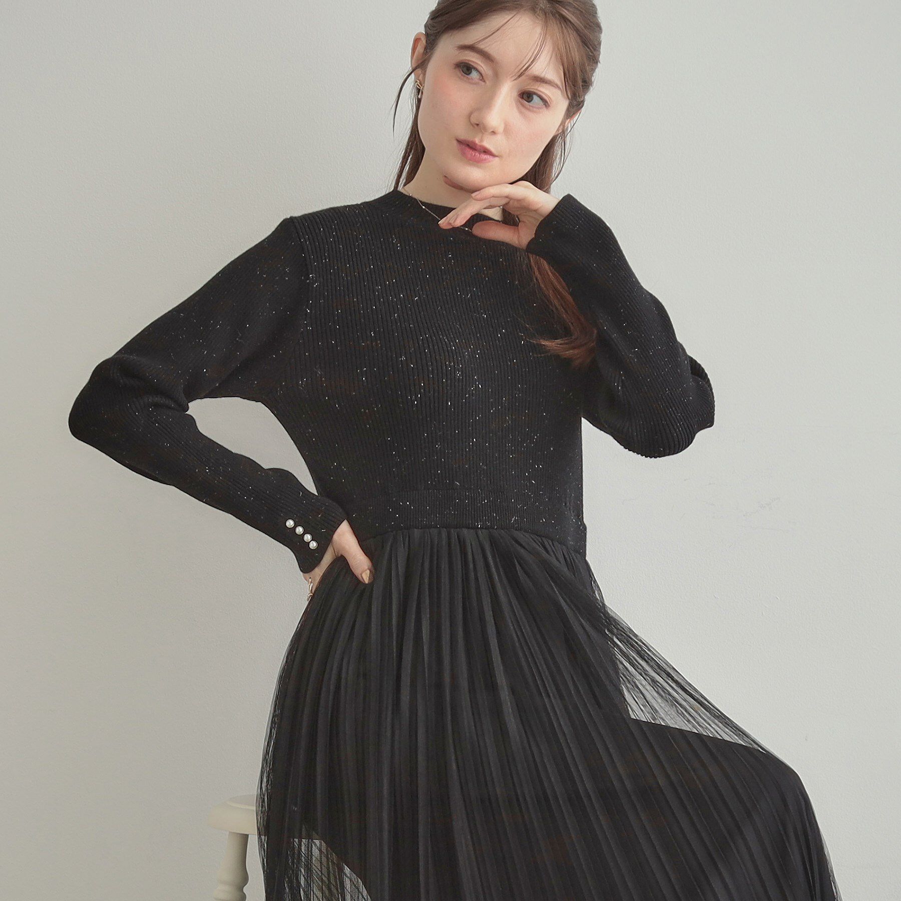 【クチュール ブローチ/Couture brooch】 【S-LL/キラキラリブニット】チュールドッキング ワンピース