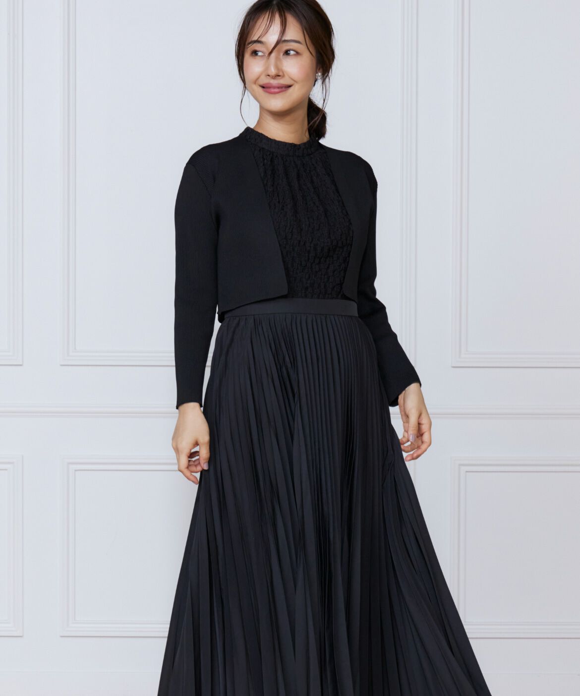 ■デザインセレモニー用として活躍する上品なプリーツ使いのロングワンピース。上身頃は立体的で伸縮性のあるレースが顔周りを華やかに見せてくれます。スカー.. |
