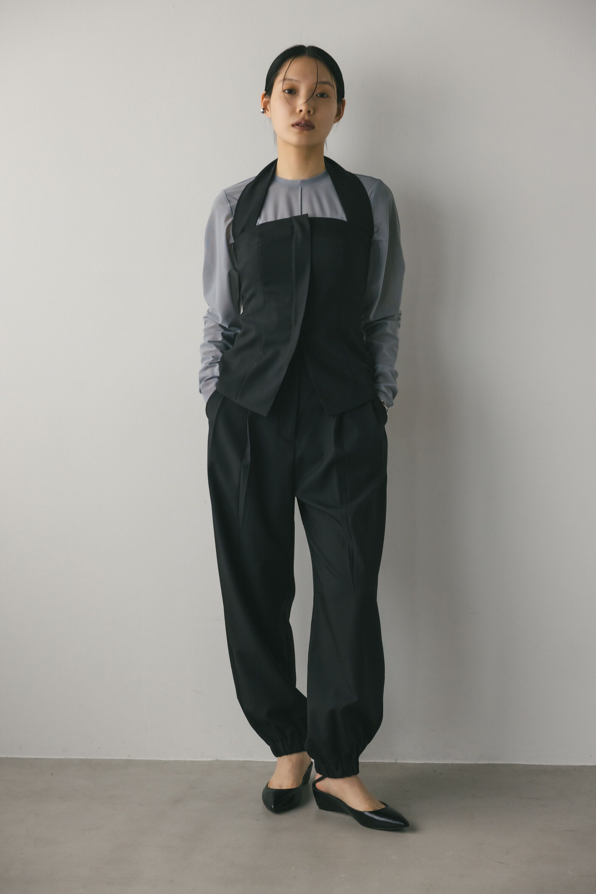 モデル身長167cm(Mサイズ着用)メリハリのあるスタイリングに導いてくれるオールインワン。トレンド感のあるホルターネックでインナーレイヤードも様になる一.. |