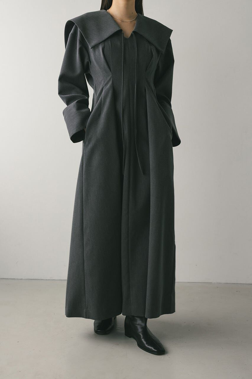 モデル身長163cm(Mサイズ着用)モードなワイドな袖口とビックカラーがポイントのワンピース。ウエストにタックをとったシャープなフレアシルエットが女性らし.. |