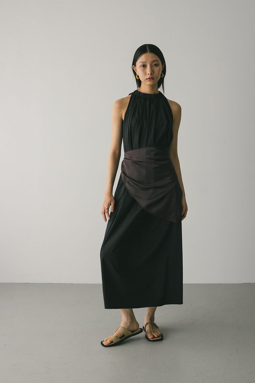 モデル身長166cm(Mサイズ着用)太目のワイドストラップがデザインポイントのワンピース。ウエストフロントのタックとダーツをとったバックシルエットにこだわ.. |