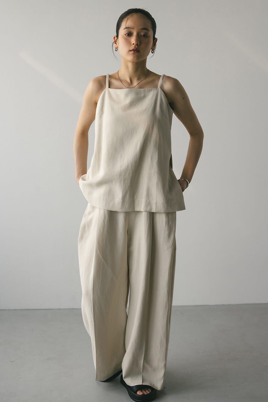 モデル身長163cm(Mサイズ着用)光沢感のあるベロア生地を使用したキャミロンパース。ワイドシルエットに深めのタックを入れることで、縦のラインを強調し、脚.. |