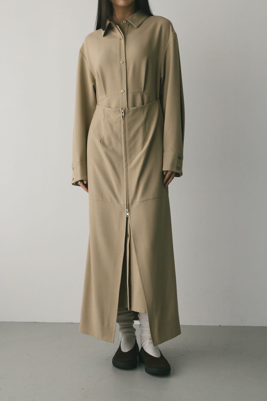 モデル身長165cm(Mサイズ着用)高め設定のウエストにたっぷりと施されたタックが美シルエットに導くシャツワンピース。バンドカラーデザインでモードで大人な.. |