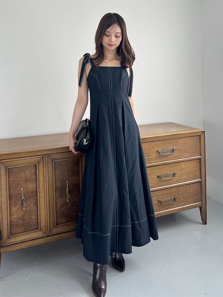 【ほんのりスポーティさをプラスした洗練シックな美シルエットワンピース】【Design/Styling】ステッチを利かせてエレガントに仕上げた、ロングテールの肩リボ.. |