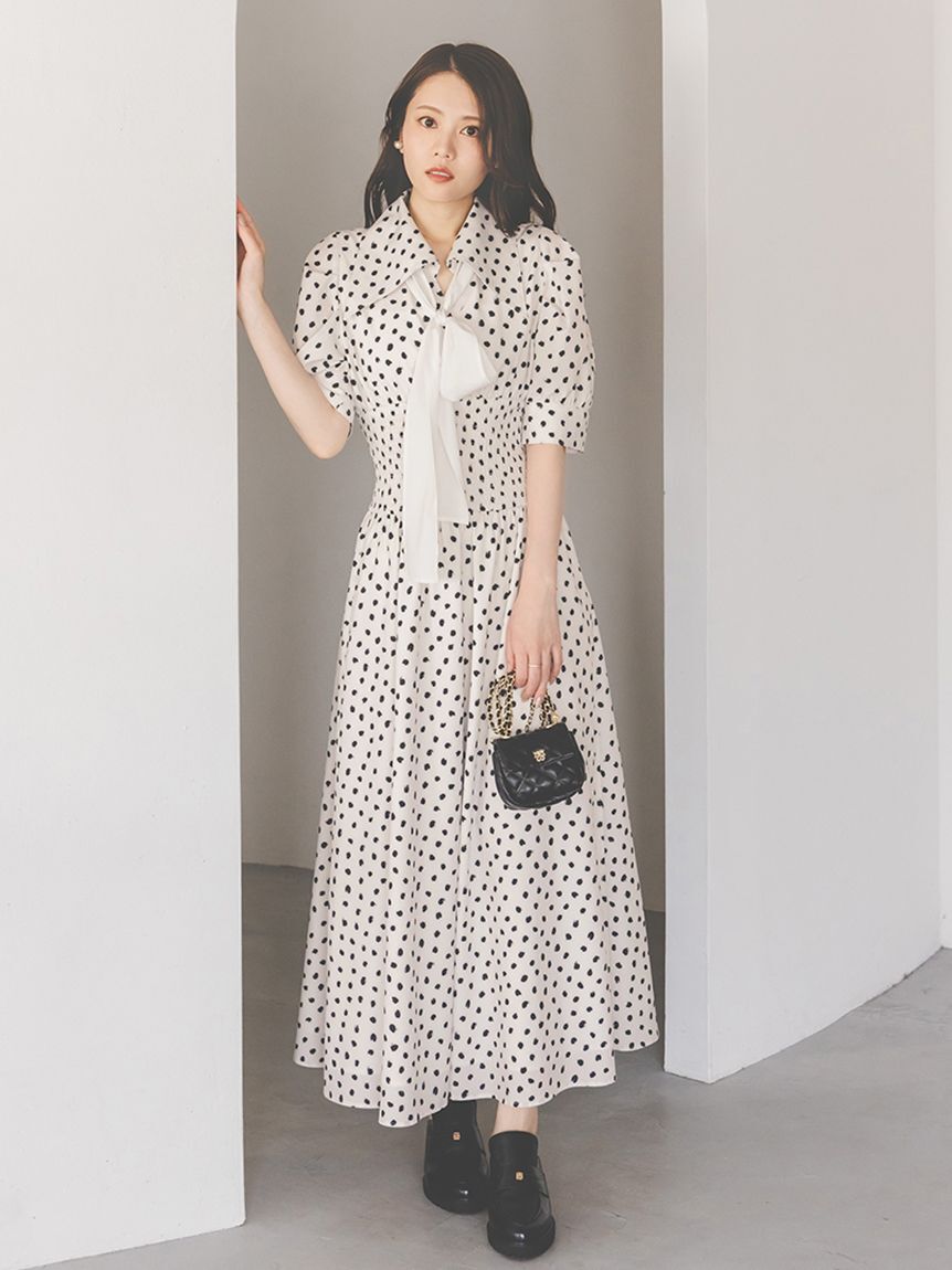 【クラシカルながら個性が光るドット柄ウエストシャーリングロングワンピースで大人な印象に】【Design/Styling】手書き風ドット柄でモード感を加えて華やかに.. |