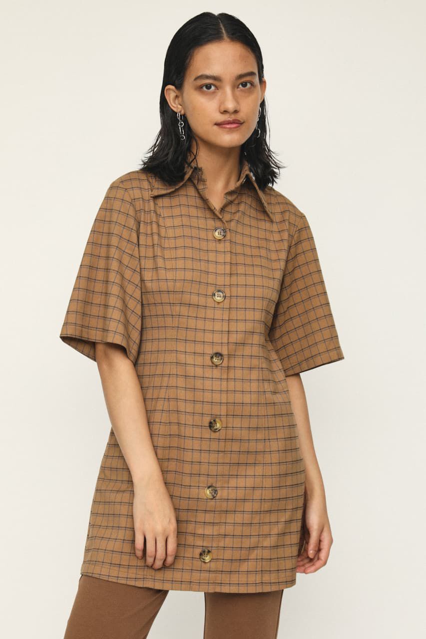 【BIG COLLAR SH OP】一枚で様になるチェック柄のシャツワンピ。あえて大きめの襟元とゆるめのフレアスリーブがポイント。下にボトムスを重ねたスタイリングも.. |