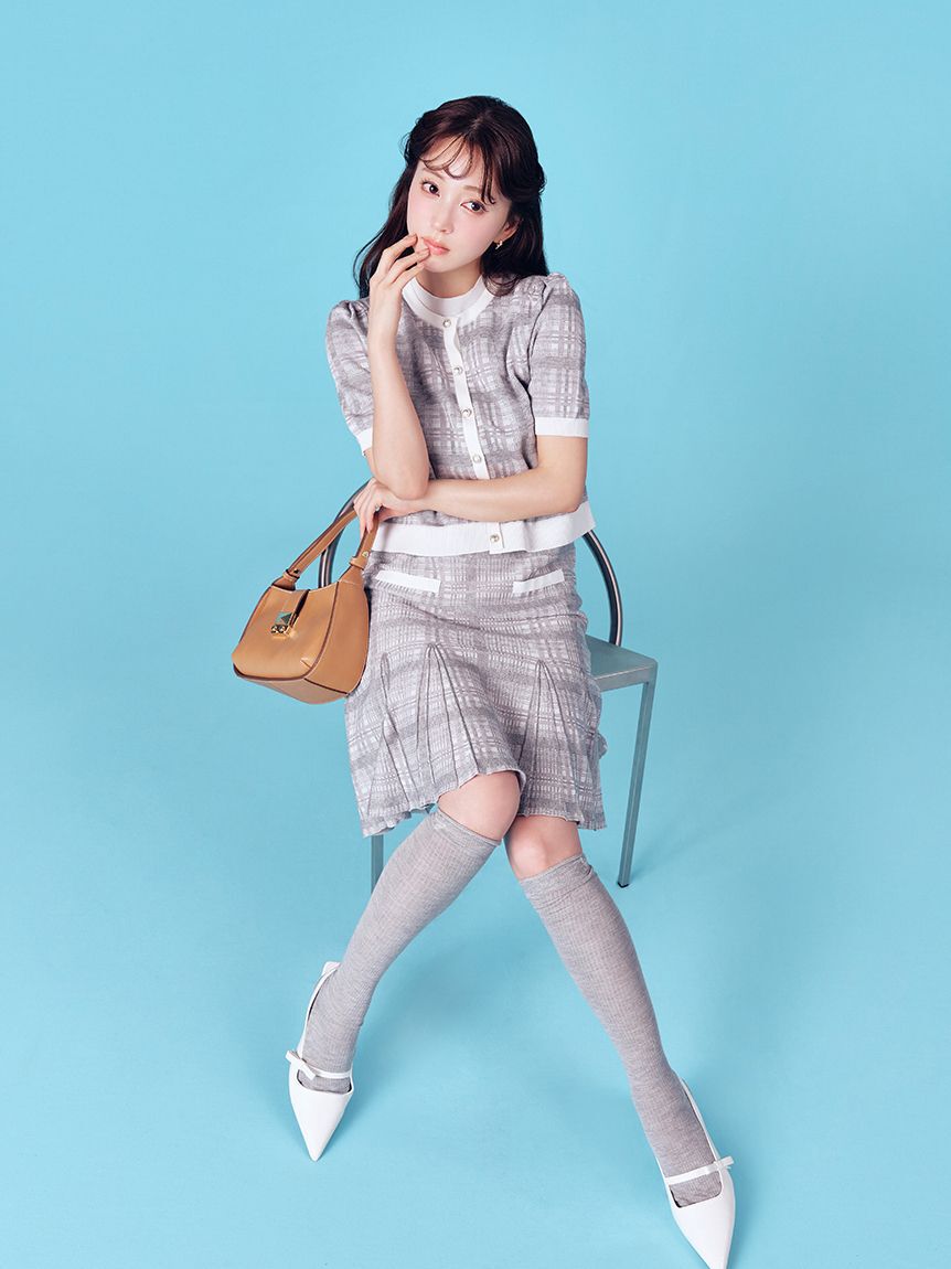 【PNKはWEB限定カラーです】繊細なチェック柄の半袖カーディガンとミニニットワンピースのセットアイテム。2種類の糸を使用し、ハイゲージのダブルジャカード.. |