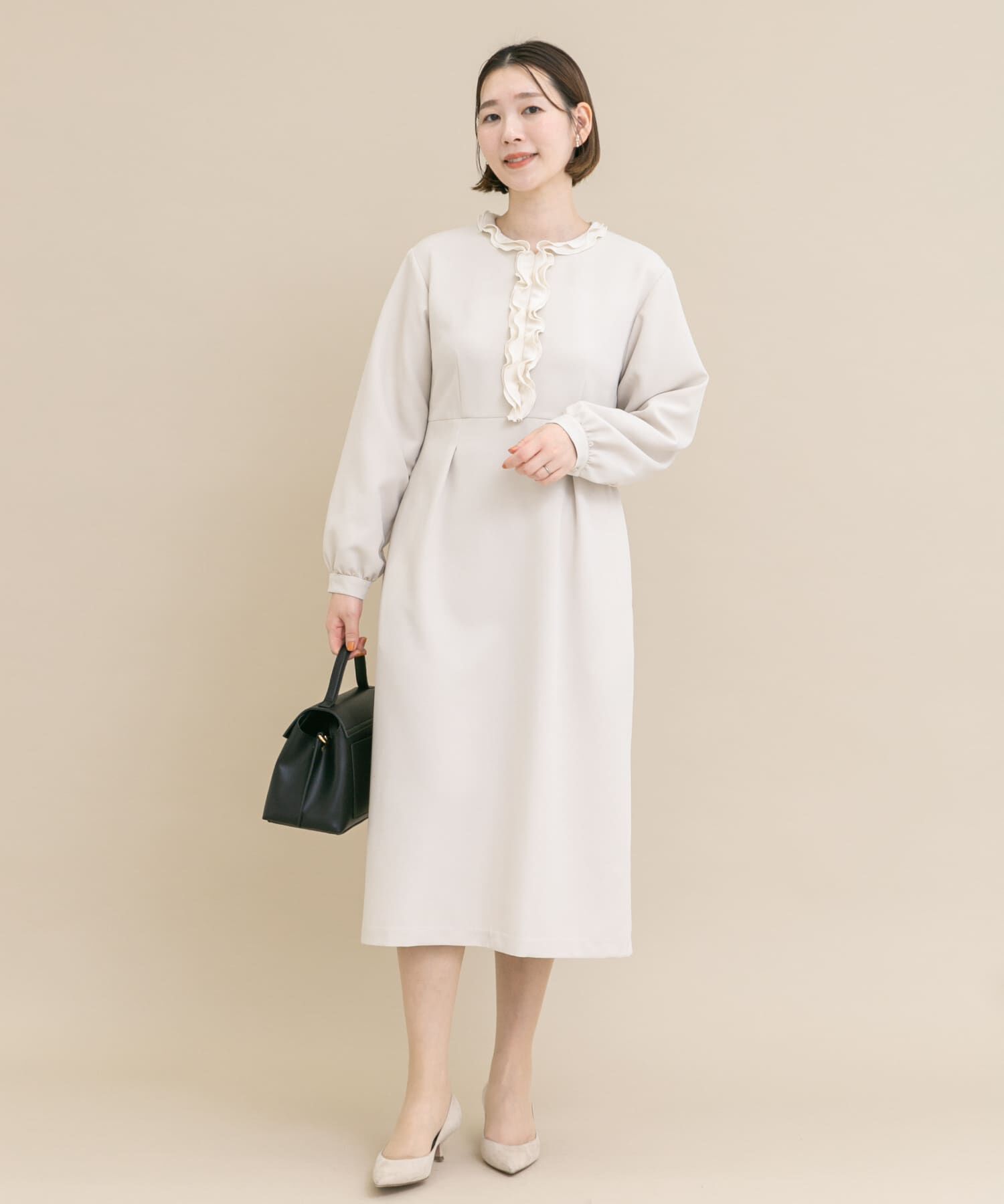 ECRUはWEB限定カラー、NAVYはWEBと一部店舗での取り扱いです。【動くたびに美しい、フリル×ウエストマーク】衿から前中心にかけて施されたフリルディテールが.. |