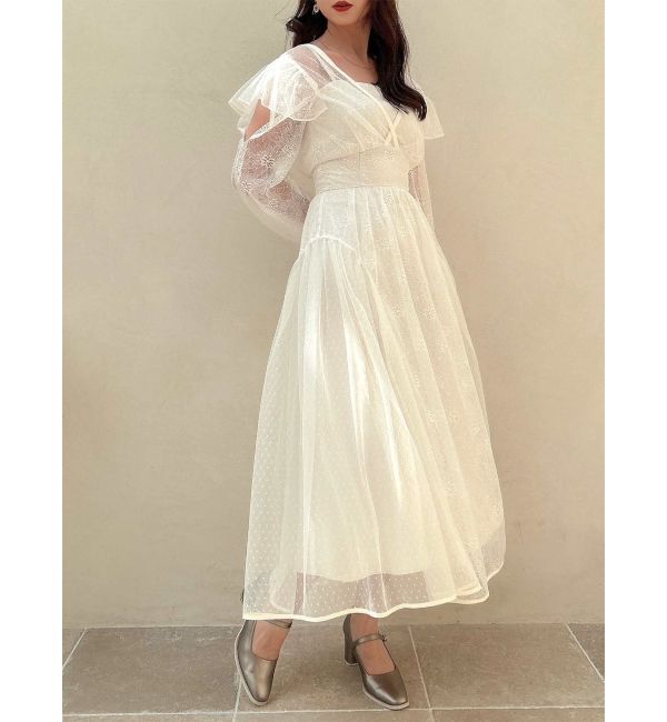チュールボレロとキャミワンピで上品コーデに?【アイテム】チュールフリルボレロがセットのキャミワンピースドレス。フェミニンなボレロにサイドプリーツを施.. |